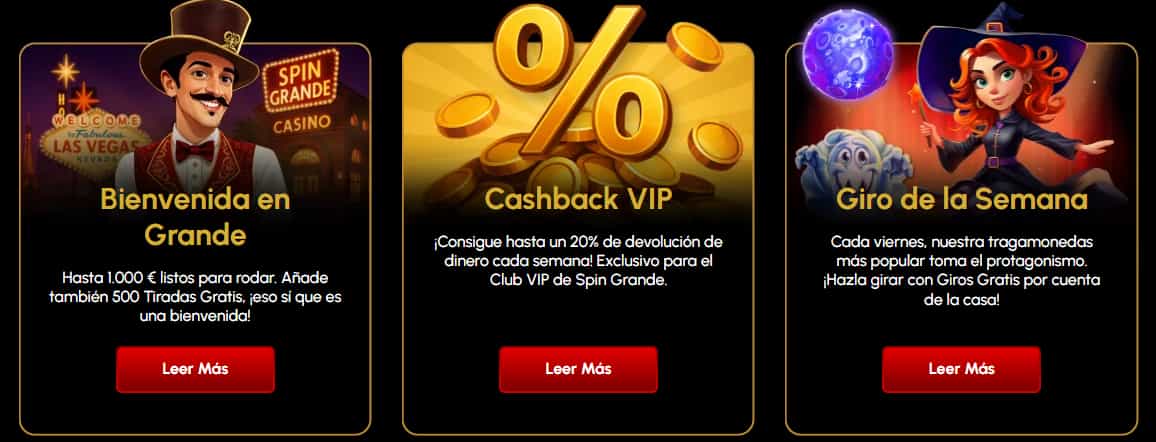Las promociones regulares mantienen la emoción en SpinGrande España. Además del bono de bienvenida, podrás disfrutar de cashback semanal, bonos de recarga y torneos con grandes premios. Los jugadores VIP obtienen ofertas exclusivas, retiradas más rápidas y gestores personales de cuenta.