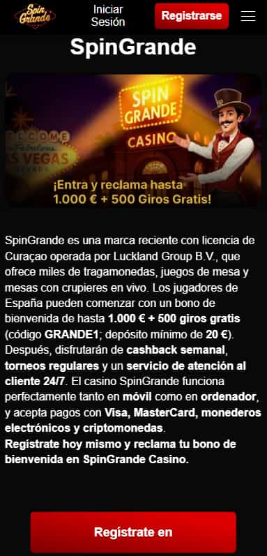 SpinGrande es una marca reciente con licencia de Curaçao operada por Luckland Group B.V., que ofrece miles de tragamonedas, juegos de mesa y mesas con crupieres en vivo. Los jugadores de España pueden comenzar con un bono de bienvenida de hasta 1.000 € + 500 giros gratis (código GRANDE1; depósito mínimo de 20 €). Después, disfrutarán de cashback semanal, torneos regulares y un servicio de atención al cliente 24/7. El casino SpinGrande funciona perfectamente tanto en móvil como en ordenador, y acepta pagos con Visa, MasterCard, monederos electrónicos y criptomonedas.